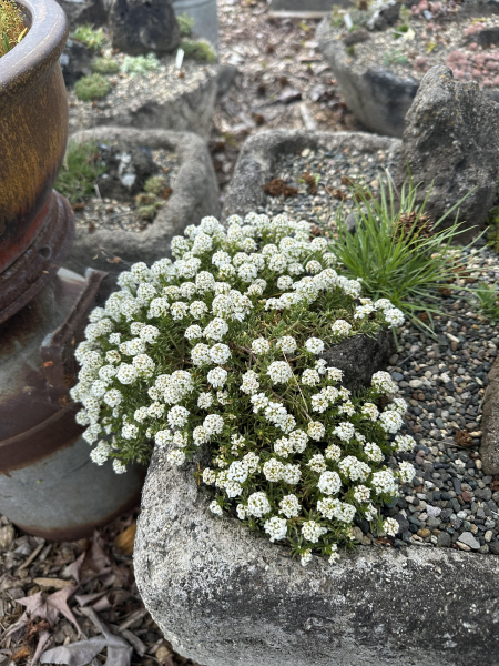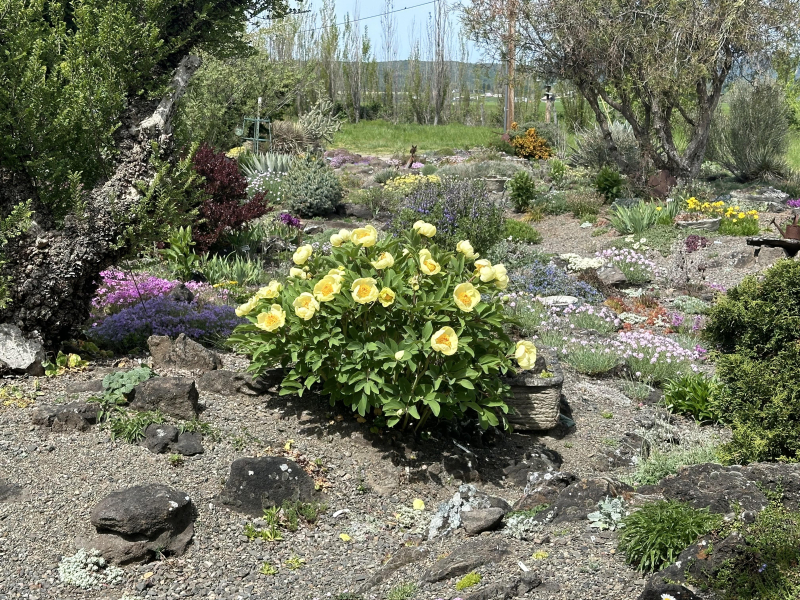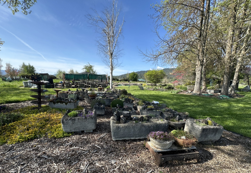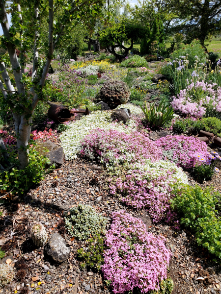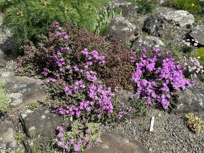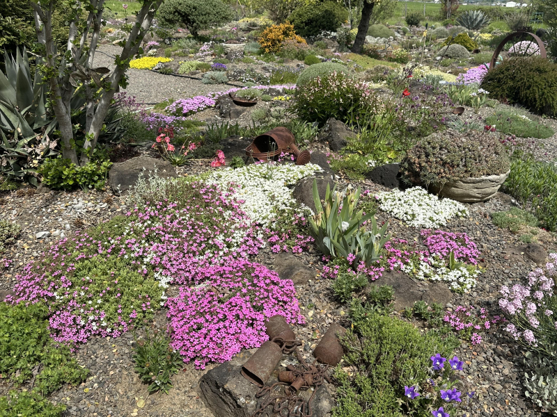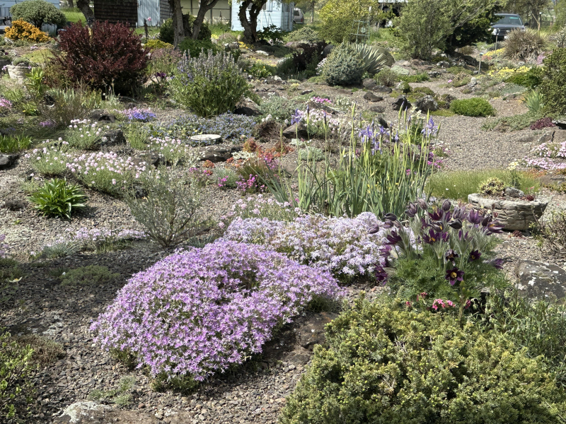 Kathy Allen is a rock star to those of us in Southern Oregon who know her and love her. She owns a small, unimposing nursery with no sign at her gate, no advertising, no fancy sales building, and no staff, just a treasure trove of the most wonderful rock garden plants on earth. Her world-class rock garden featured over the years in two Sunset Magazine issues, many local newspaper articles and Joseph Tychonievich’s 2016 book, Rock Gardening: Reimagining a Classic Style. To get there you have to have directions from someone who knows her. And once you’ve been there you’ll return time and time again. It’s hard to find: off on a country road and down a long gravel driveway lined with trees she planted thirty years ago. Once in awhile, a few neighborhood cows will get loose and come to visit.