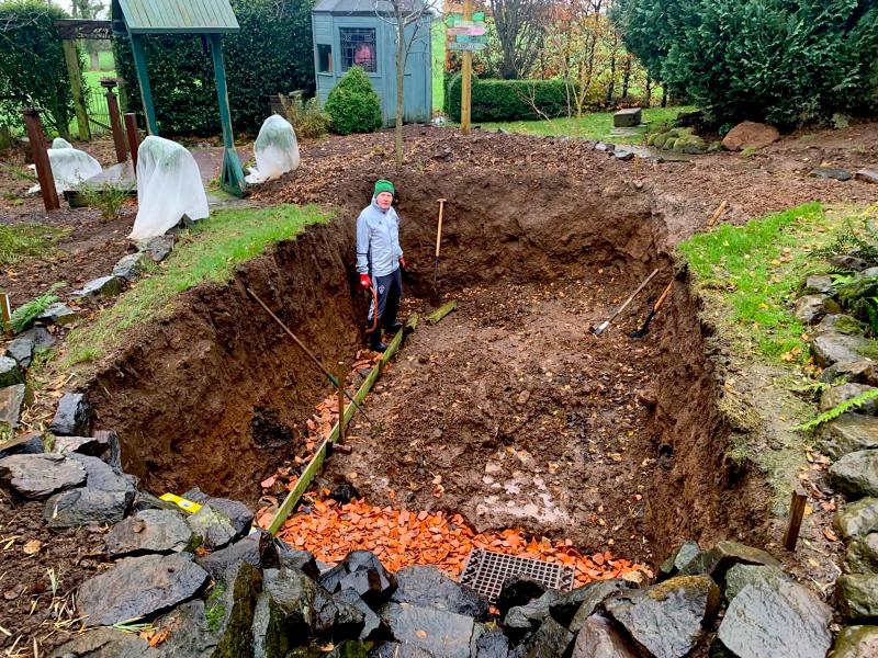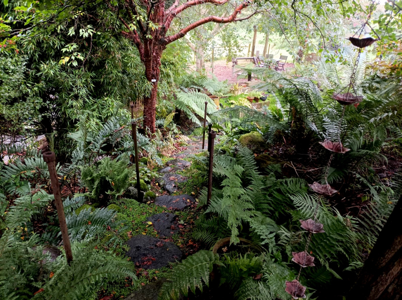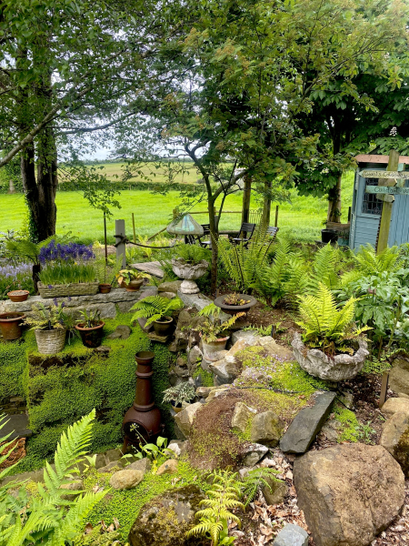 Woodgrove is a small suburban garden bordered on the north side by a four-meter-tall (13 ft) beech hedge. An arched window cut through the hedging frames the picturesque landscape beyond, giving a vista of the Irish countryside, with sheep and cows grazing in the lush green fields. Within the garden, a small water feature composed of a stream and pond adds interest and is home to dozens of frogs that spawn there each spring. I created the feature some years ago with marginal planting including deciduous shuttlecock ferns (Matteuccia struthiopteris), deer fern (Blechnum spicant), and Korean rock fern (Polystichum luctuosum) making a perfect companion planting alongside bog iris, astilbe, candelabra primula, and marsh marigold. A water lily adds to the ambiance, creating a peaceful place to contemplate and relax to the therapeutic sound of the water flow.