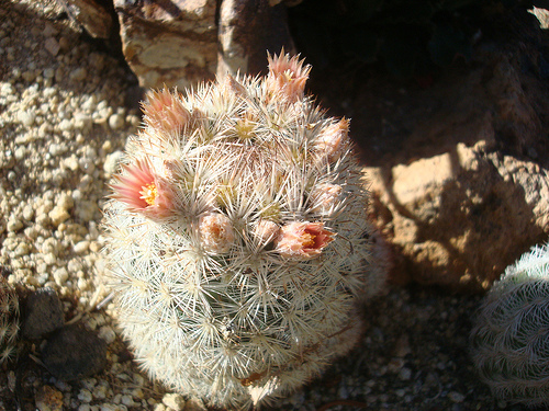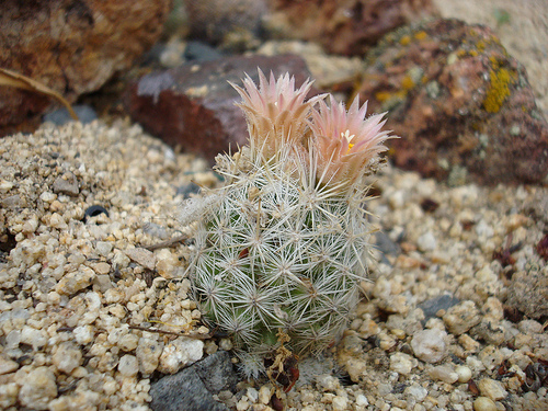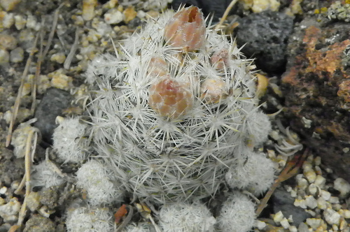 Rare in it's native habitat. These tiny cactus can often form large mounding clumps, with a lopsided pyramid look reaching a foot or more across.