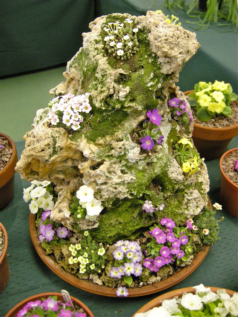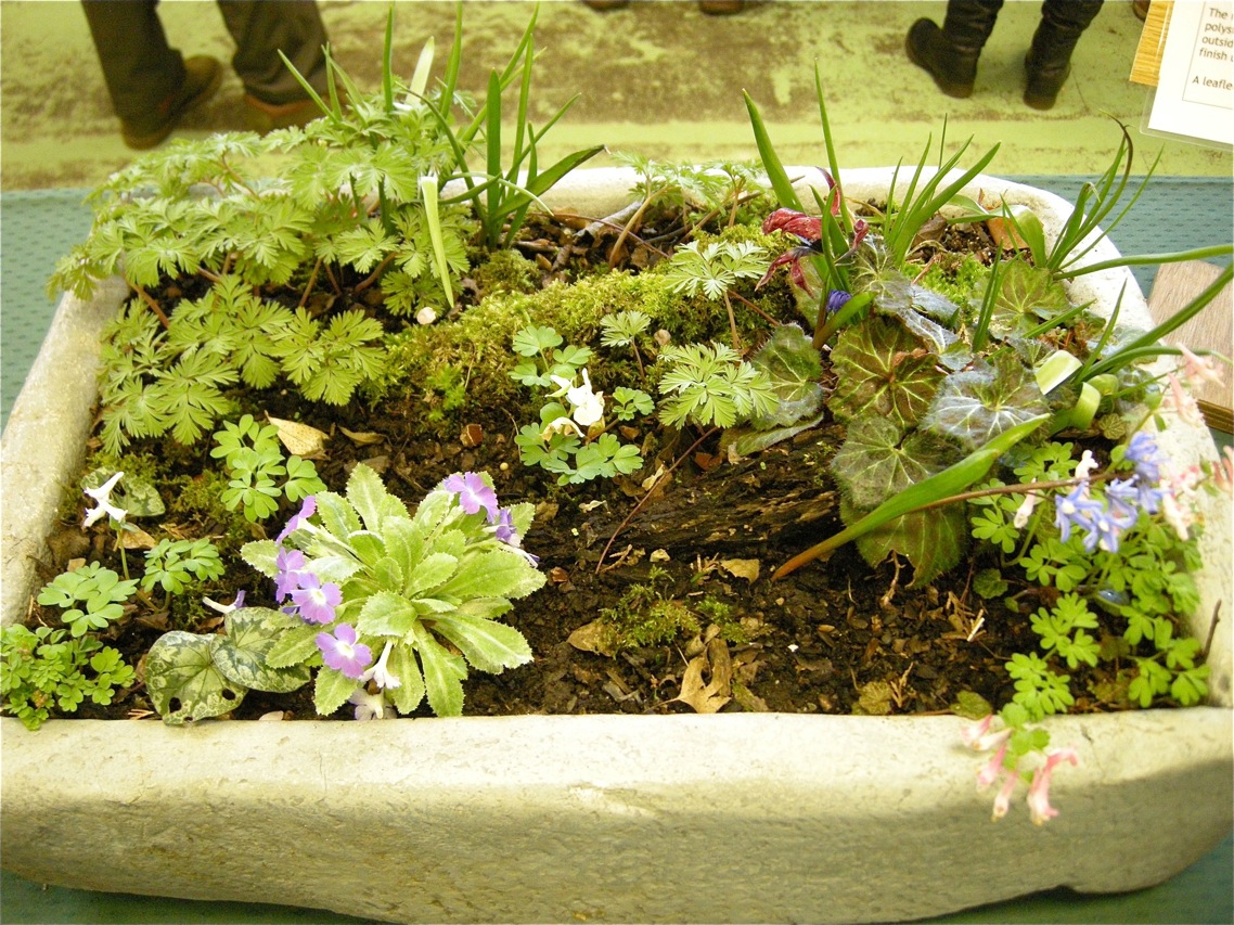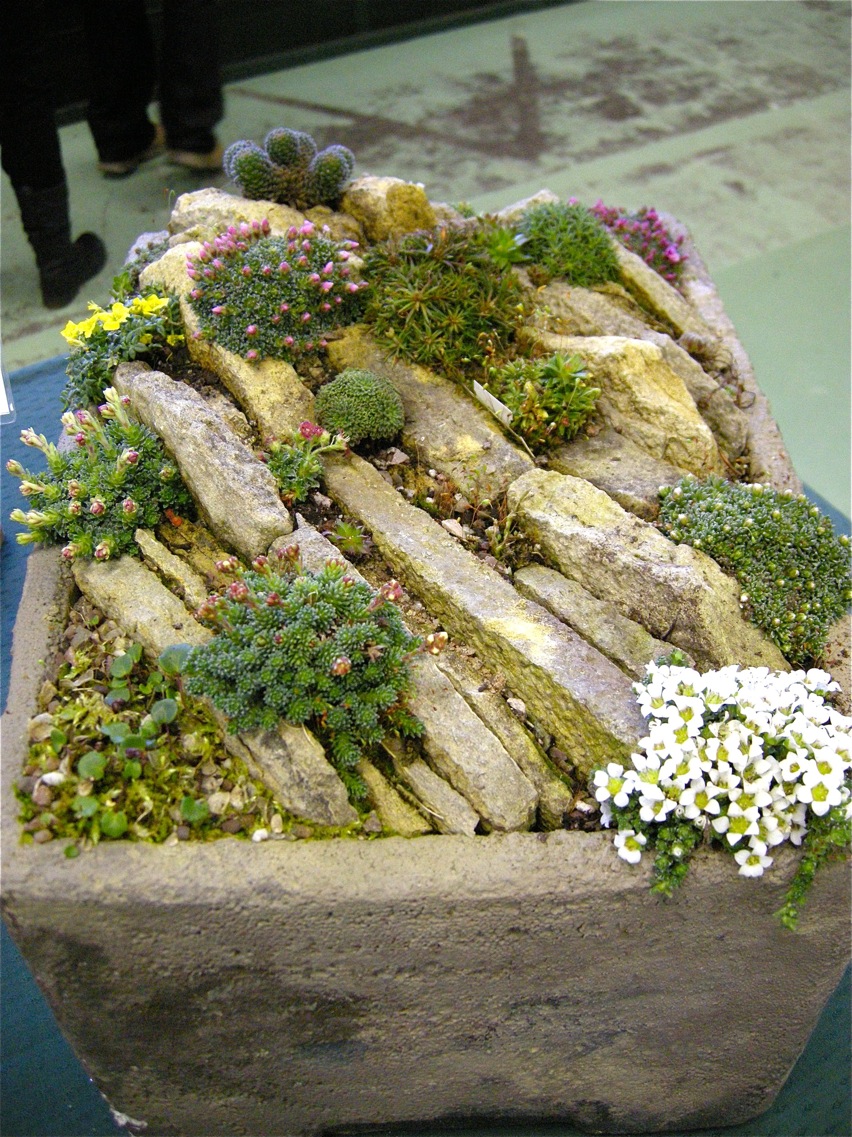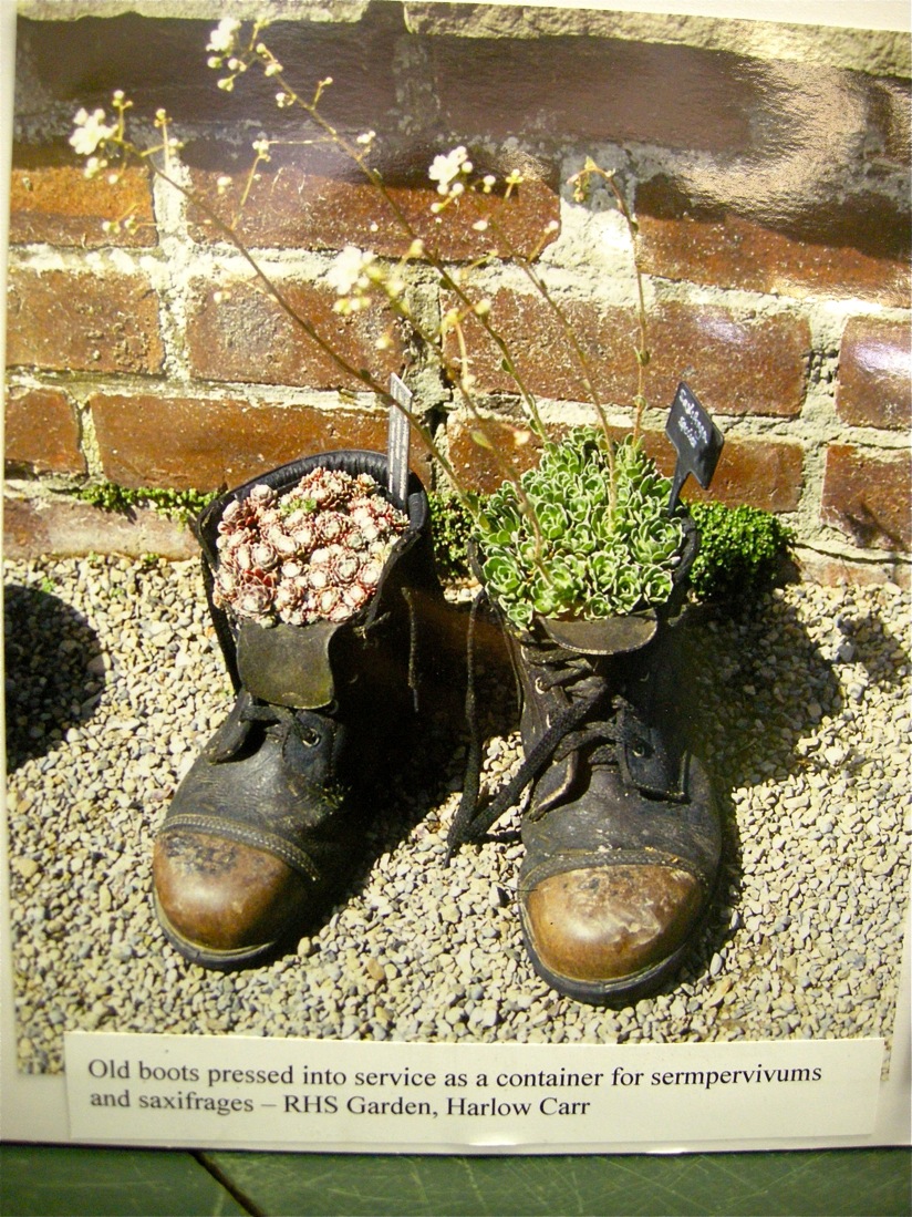 I was especially interested in the Fish Box troughs, discussed earlier on, and there were some nice examples of these. Also, one exhibitor in particular, David Philbey, specialises in growing choice alpines in tufa, and here is a fine example. If you are not so well off what about an old pair of boots!