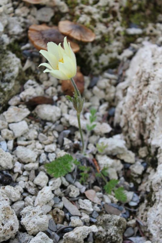 My supposed Pulsatilla patens v. flavescens seedling (I wonder about the identity because it puts out leaves before flowering unlike our native P. patens) Acck, just realized today that t's actually Pulsatilla albana ssp. lutea.... which makes sense!; unusual flower form of P. vulgaris:
