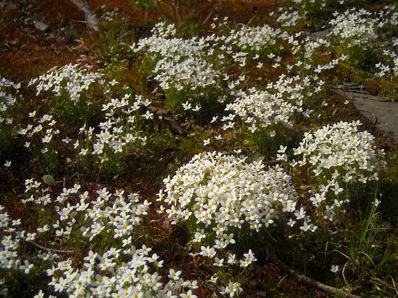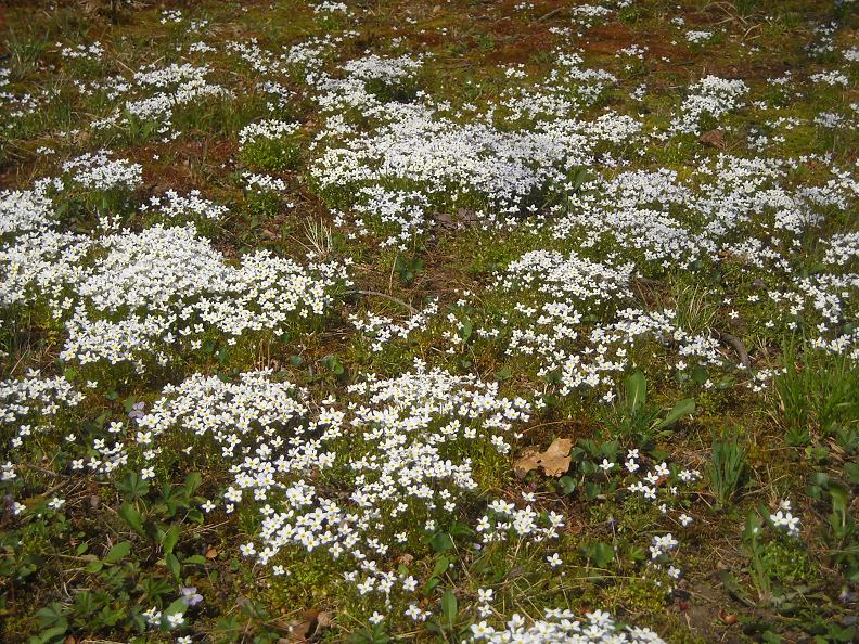 Occasionally serendipity happens. On an unusually hot Sunday afternoon late April 2009, I ran a local 10k road race in Groton, Massachusetts. After the race, I walked back to a large business where runners were allowed to park. I crossed the multi-acre lawn in front of the business, approaching a partly sunny hollow at the edge of a grove of mature trees, and there before me was a fantastic colony of Houstonia caerulea. These were in a somewhat drier site without the luxuriant hemispherical domes mentioned previously, but nonetheless an exciting colony of variable Bluets.