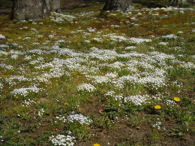 But I have seen specimens that dazzle the eye and spark the imagination, a rock gardener's dream to be sure. Typically such spectacular plants, as I have spotted them, are growing in moist locations in neighborhood lawns amongst lush, deep green spring grass, where trespasser's shall not venture, but the eye strains for glimpses of 6" round domed mounds of pristine white, as if imitating Aretian Androsace, at least from afar, but merely growing in someone's lawn! The prospect so close, yet unreachable. I imagine knocking on someone's door with what would surely seem a bizarre and suspect request to gain access to these magnificent domes of white, for a petite snippet, when they are mere "weeds" in someone's un-mown spring lawn.