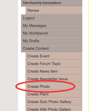 To add a photo to a plant, you will notice on the page nargs.org/user that there is a link over on the left side allowing you to "Create Photo" (see image).