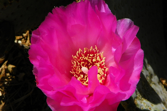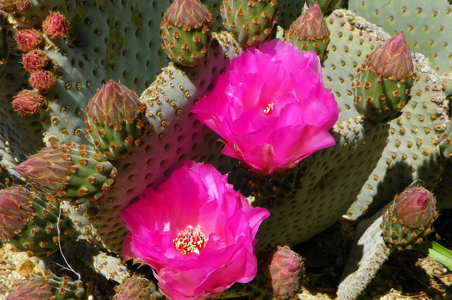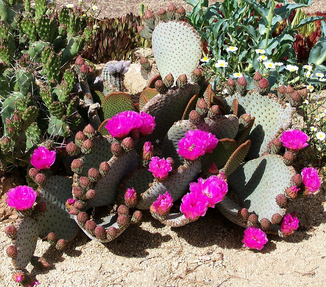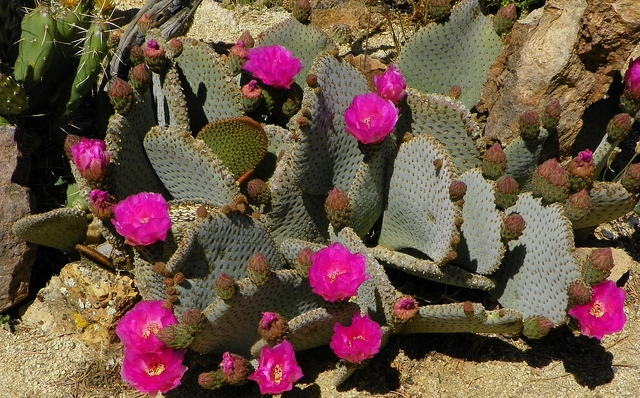I grow several forms and varieties of O. basilaris. The beavertail cactus is native to the Mojave and Sonoran deserts to about to 6,000 feet. The blue-gray 10inch long pads are shaped like a beaver's tail. Dense clusters of brown glochids are it's main defence.the flowers are hot pink/magenta. The fruits are dry and pearshaped. Mature clumps can get to be two foot tall and three to four foot across.