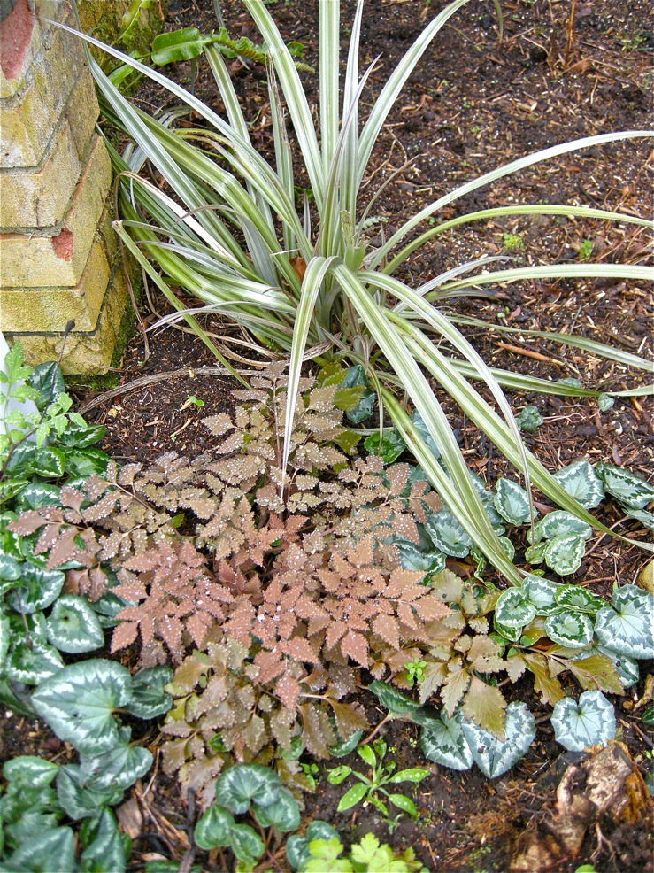Corydalis quantmeyeriana 'Chocolate Stars' growing with cyclamen and Astelia nervosa. The corydalis is new to me and I haven't yet seen the flowers, but what foliage! I rather like this combination.