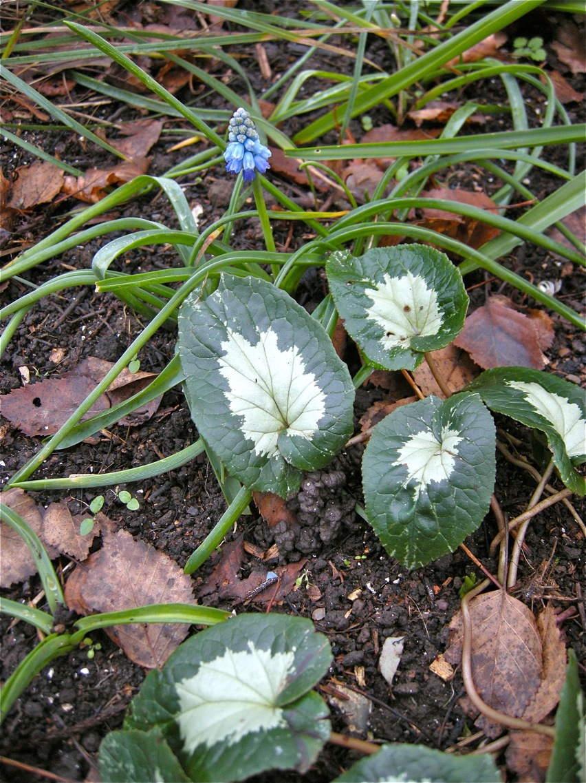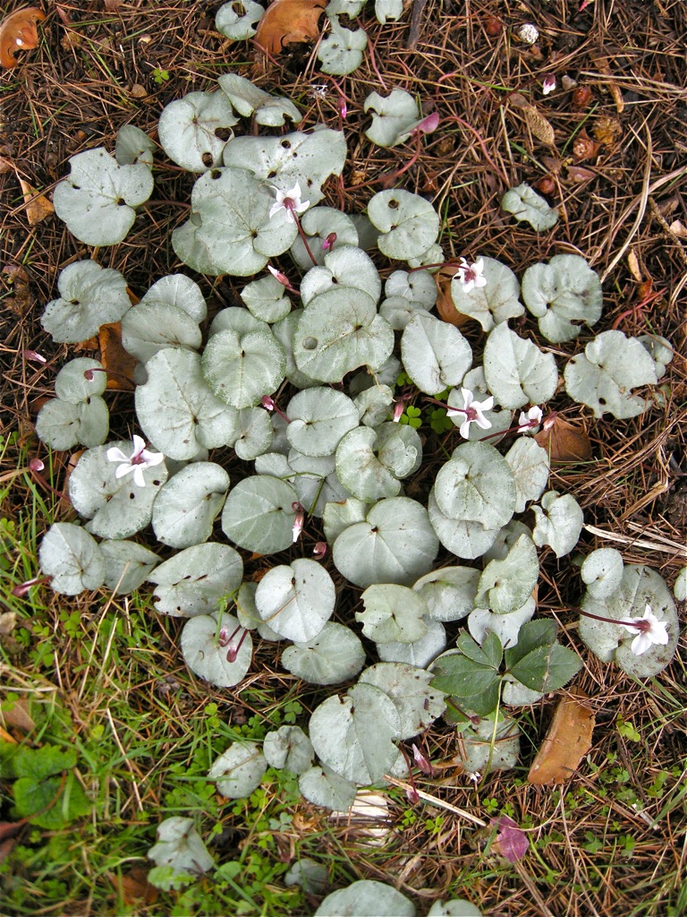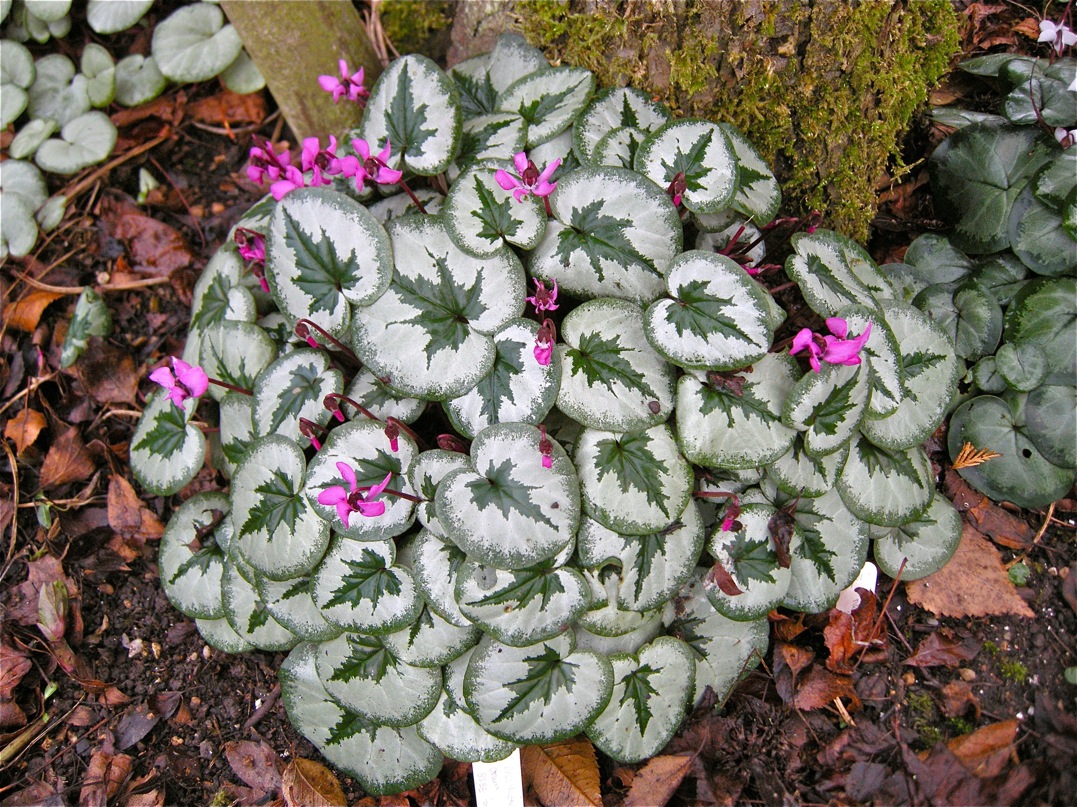 Cyclamen coum. Two forms with very silvered leaves from Tilebarn Nursery.