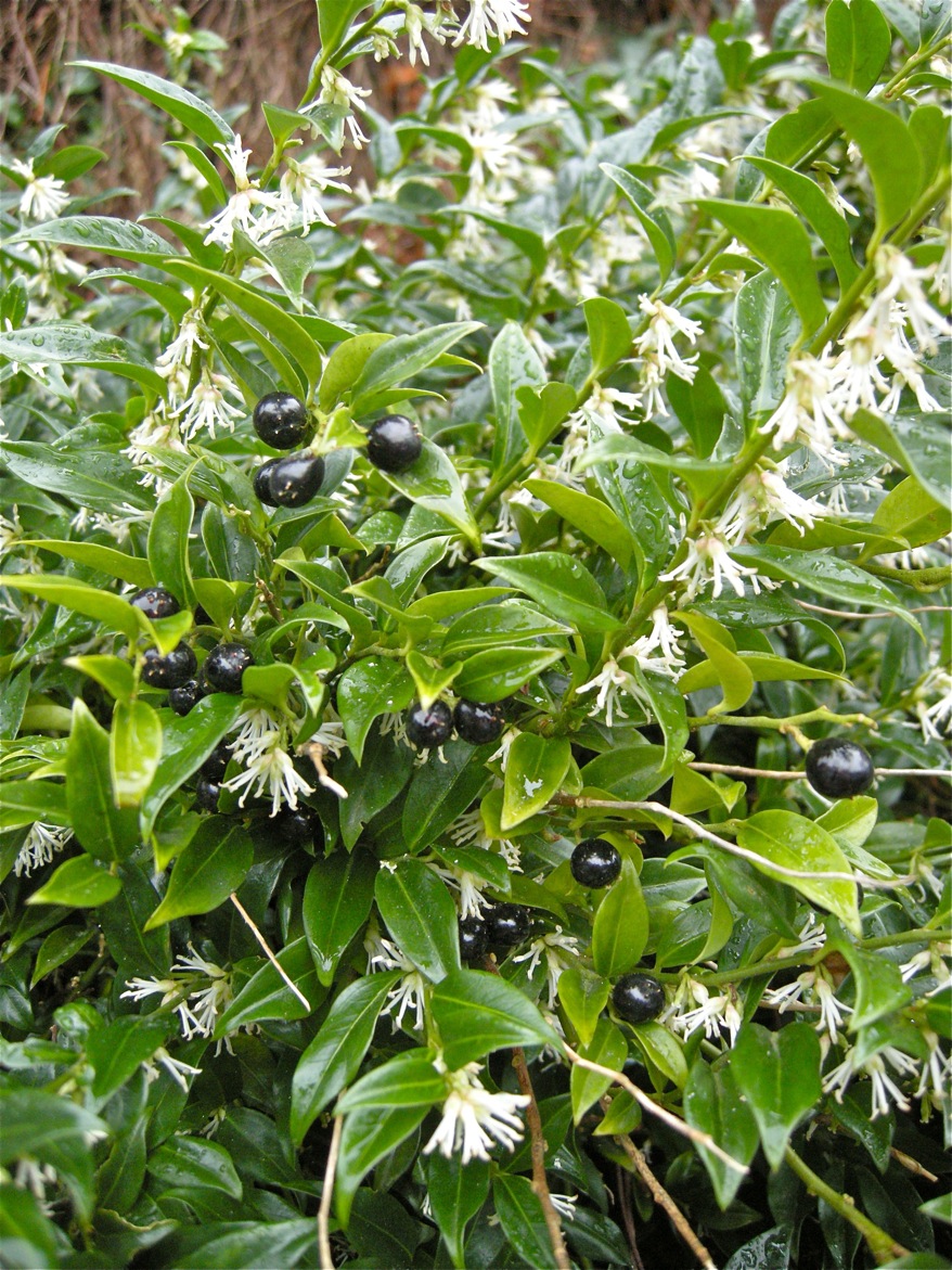 Sarcococca confusa. An unassuming shrub but one of the most delightful and scented winter flowers, and usefully tolerant of dry shade.