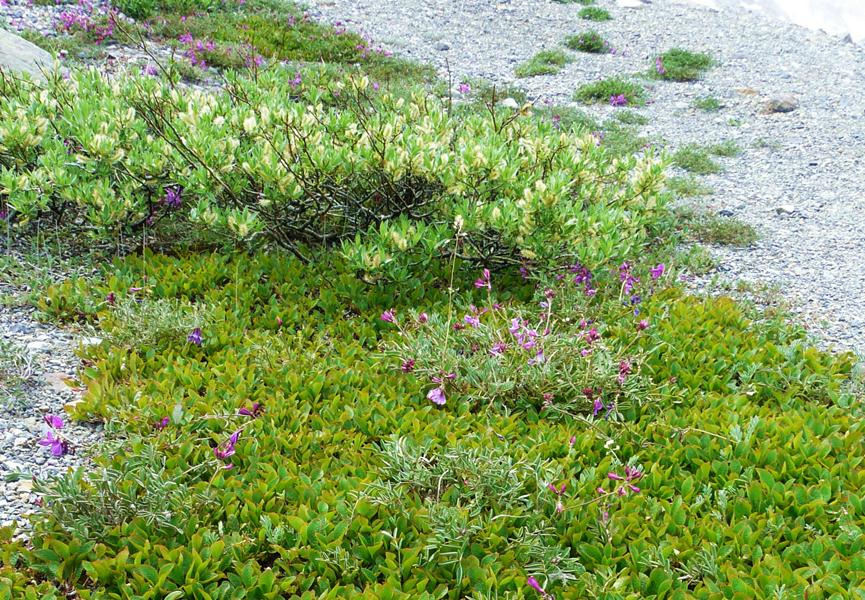 Another pea of uncertain name-- foliage looked like the high altitude Hedysarum boreale common at this site--rather fleshy leaves, but only some plants had these tumble-weed like structures of last year's stems.. Looking at last year's pics, I was reminded that there was another pea--possibly an Astragalus, with pale flowers and similar semi-prostrate stems and similar leaves. Looking at the old pics, I cannot tell for sure which plant would have had these dried stems, but it seems like the Hedysarum show more dried stems in the photos.. not sure why only some plants have this, if its not a different species.. also a view of the typical miniature forest- a couple of Dryas spp, a couple of Arctostaphylos, various peas, etc...