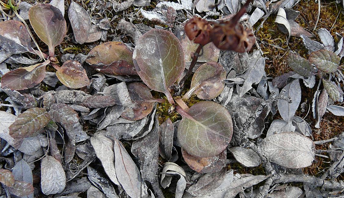 A bit farther back were some willows, Salix sp -maybe around a metre tall, and I was interested to see Pyrola sp for the first time up here, under the Salix at the lip of the flood plain ......