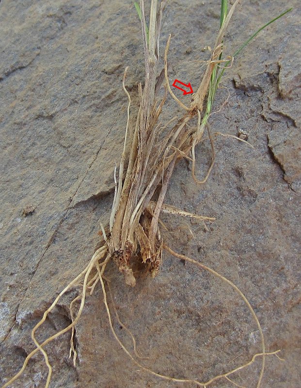 In the photo, the red arrow points to a young shoot on a vertical stolon over 2" above the parent bulbs, to the right is another green shoot on a vertical stolon.