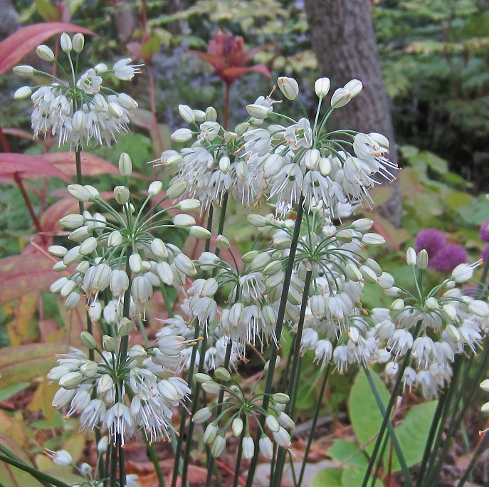 My favorite is a robust white form of Allium thunbergii that I find to be a particularly good garden plant, growing about 14"-16" tall. It is stronger growing than some other white forms I have tried. In one photo, you'll see Allium sacculiferum in the background, for size comparison.