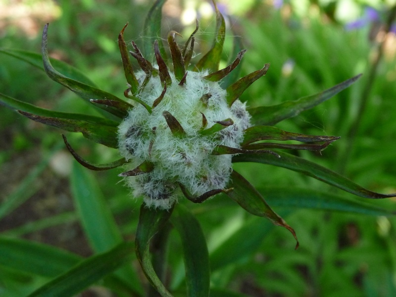 On to Saussurea nidularis. Attractive linear leaves, mostly smooth, but this is a larger plant than the above. Individual leaves probably around 1o-15cm long, and flowering stems probably more than 30cm tall- I need to take out a ruler to measure! Not 100% sure if the id was correct, as the description mentions pink bracts and a rounded inflorescence, which doesn't sound quite like this- but my conditions are doubtless different from where they came,, and first flowering, so maybe time will tell.....