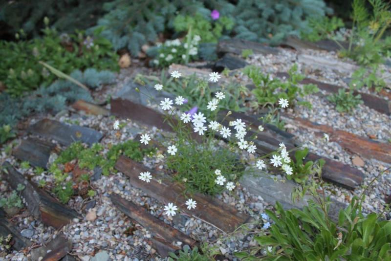 Saxifraga 'Whitehill', being overtaken by Nepeta podostachys... somebody's gonna have to move; Delphinium beesianum; Anthemis cretica ssp. leucanthemoides: