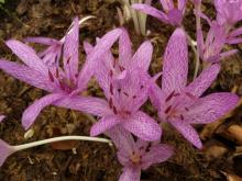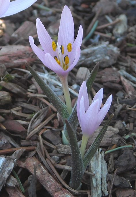 "A dwarf colchicum which flowers in late winter or very early in spring with 2.5 cm long,nice mid-pink flowers with contrasting black anthers. Leaves more or less covered with silvery hairs."