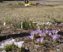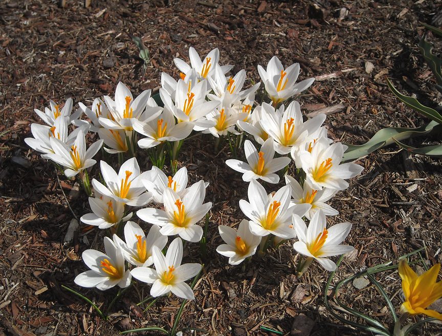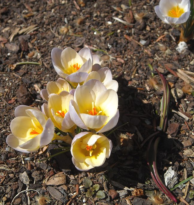 Left:  from a few bulbs in 2002, a clump of Crocus kosaninii is picture-perfect today; hardly a finer spring crocus species.