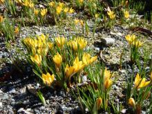 One of the very best dwarf species with charming tiny flowers and gregarious colonizing habit, is C. kosaninii.  While under snow for two days, this species appeared and is jumping at the chance to bloom.  In a couple view, the gold-yellow is C. angustifolius.  Last year, I believe due to the unrelenting heat and drought, this species set no seed.