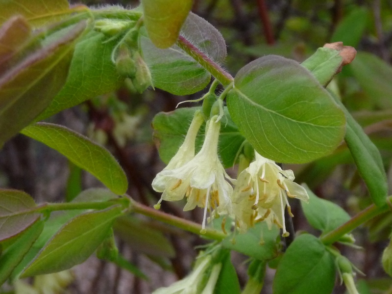 Lonicera caerulea has been blooming since mid March.  The flowers are not that beautiful, but they bloom even before any pussywillows produce pollen, so they are very welcoming for early foraging bees.  This one is one of the early varieties (circa 1996?) called 'Czech no. 17' (Berry Blue™).