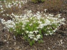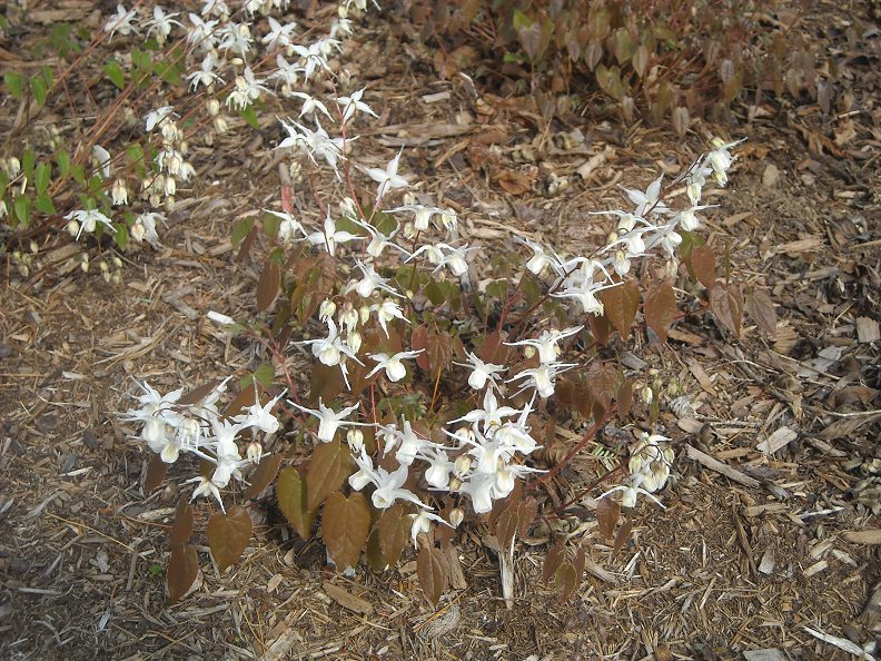 The photo of E. grandiflorum 'White Queen' shows that we must not dismiss the older cultivars; this one is exceptional and very inexpensive as Epimedium go ($6), with lovely bronzed new growth and really dense sprays of white purple-tinged flowers.