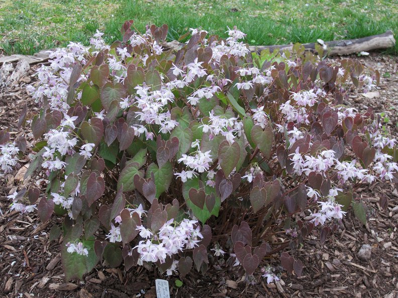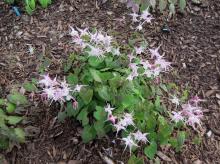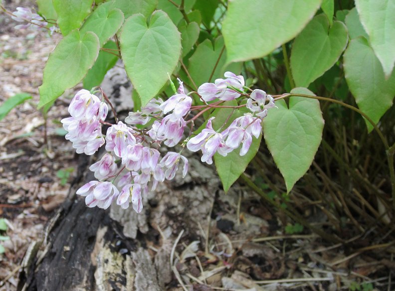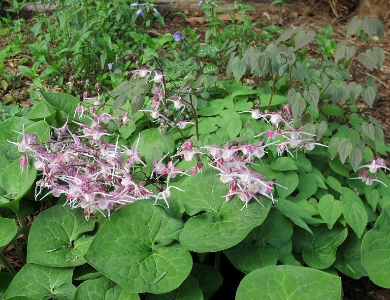 Epimedium grandiflorum 'Tama No Genpei' - a really good one, with large starry bicolored lavender pink and white blooms, and dark purplish foliage, particularly when first emerging. The leaves in front are Asarum canadense.