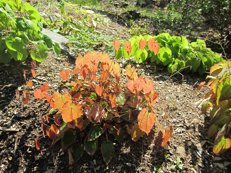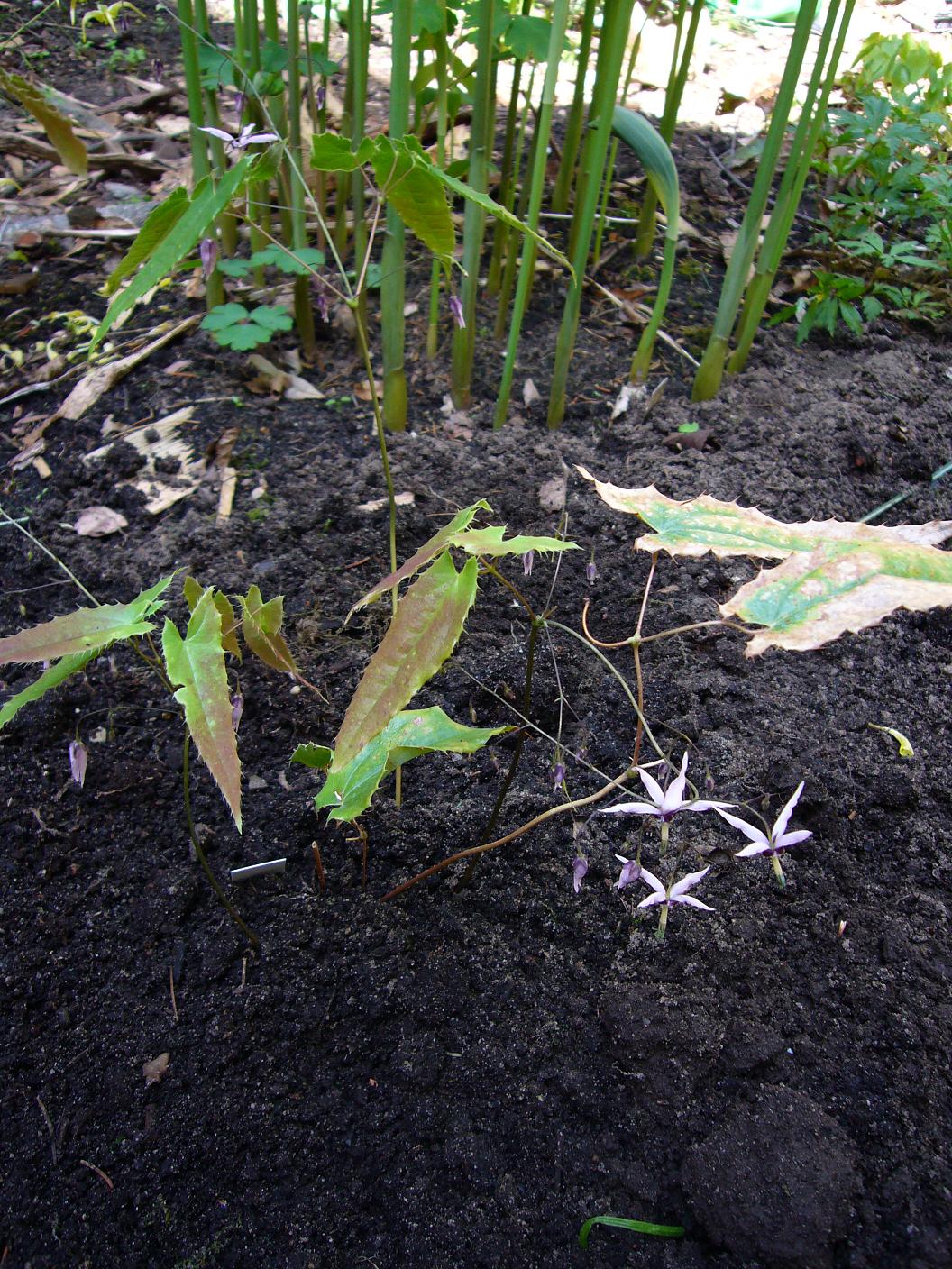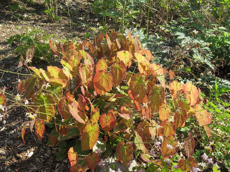 Two views of an Epimedium sempervirens hybrid that I have selected. It it noteworthy on several counts, it forms a large rounded clump, the early foliage is dramatically dark purplish brown turning a lighter coffee tone, eventually green, and flowers, while pale, presented above the foliage. Autumn color is deep mahogany.