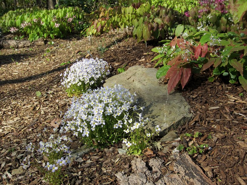 8. In the center right is Epimedium pubescens 'Shaanxi Form'. It is early to emerge and was whacked by a very hard frost, the stems and leaf growth hanging limp, but it has recovered. I've been adding pieces of Bluets, Houstonia caerulea to line the paths, and they quickly bulk up into wonderful clumps that flowers for months.