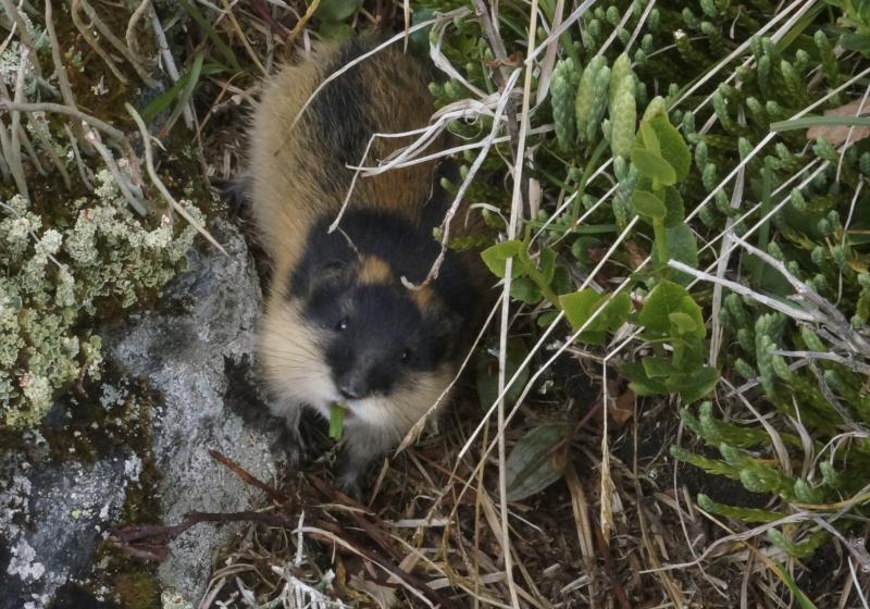 Viscaria alpina One of the angry inhabitants, a lemming. Moss with morning dew.