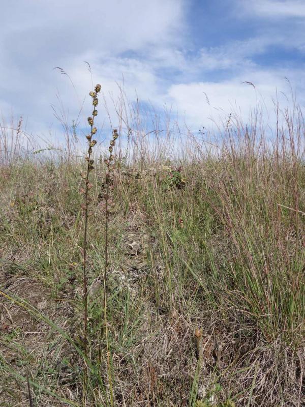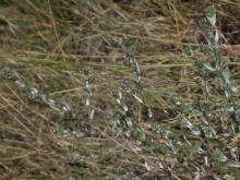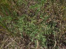 Astragalus crassicarpus grows on a south facing steep slope. At only 1500ft elevation and among other taller (12-16 inch) grasses, it is less compact than in a more mountainous climate. The gray or tan "eggs" nestled in the soil are the seed pods.