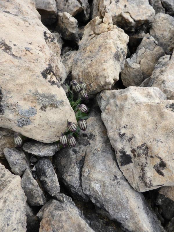 Up and up a steep slope through more talus (our chosen route to get past, actually around, the second headwall)... and tucked in here and there, some plant life: Hooker's Thistle, Cirsium hookerianum; grass-of-parnassus, Parnassia fimbriata, and Arnica sp.;