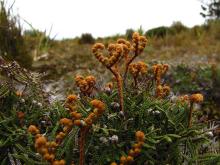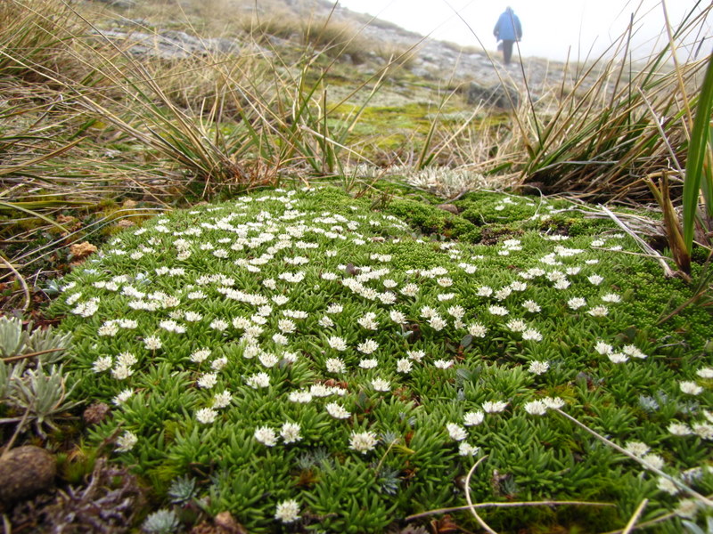 Donatia novae zelandiae forms hard dark green cushions with small flowers that sit directly on the leaves and has wide distribution from coastal to subalpine areas.