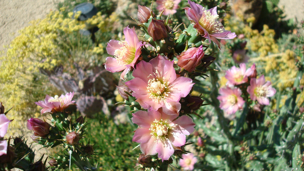 Here is variety Cylindropuntia imbricata var. argentea from south western Texas. It grows as a shorter shrub with  longer stout spines than you find on var. arborescens. The blossoms are identical in these varieties.