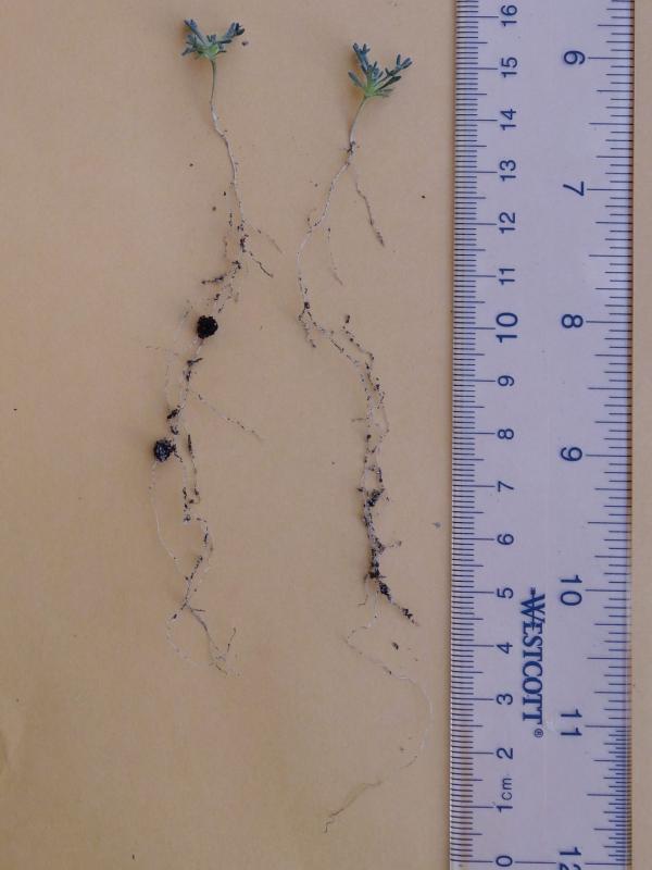 Erigeron compositus Red Desert.  Emerged in 7 days.  These have even longer roots.