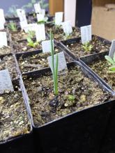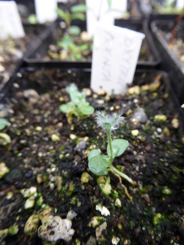 Mihuenia poeppigii. Sown 12 Sept 2014.  One seed emerged on 7 Oct, and did not survive our zone 4 winter.  The rest emerged in unison the following spring, on 30 April 2015.