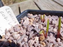 Lewisia rediviva wild collected seed in Washington state, emerged 9 April 2015 after planting the previous fall and wintering outside.