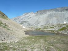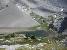 Last tarn, and for scale, that's me in the red shirt and backpack, seeing what's growing among the talus...  :)