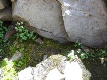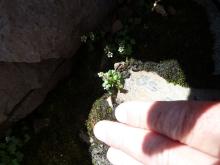 Snuggled among the talus blocks with its roots in snowmelt was a colony of tiny Romanzoffia sitchensis. ????  (Second photo to show scale!)  Correction:  Identified as Saxifraga rivularis on Jan. 21, 2013.  Thanks, Mark!