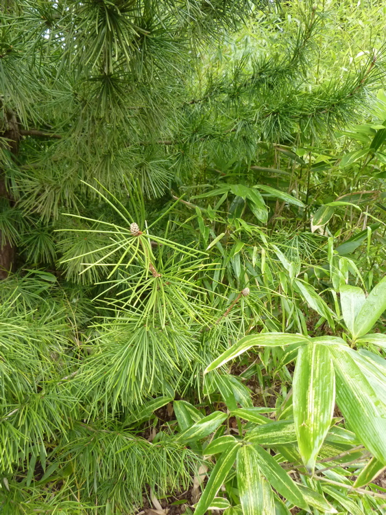 View; Umbrella pine (Sciadopitys verticillata) and bamboo; Erica; Fritillaria persica; view.