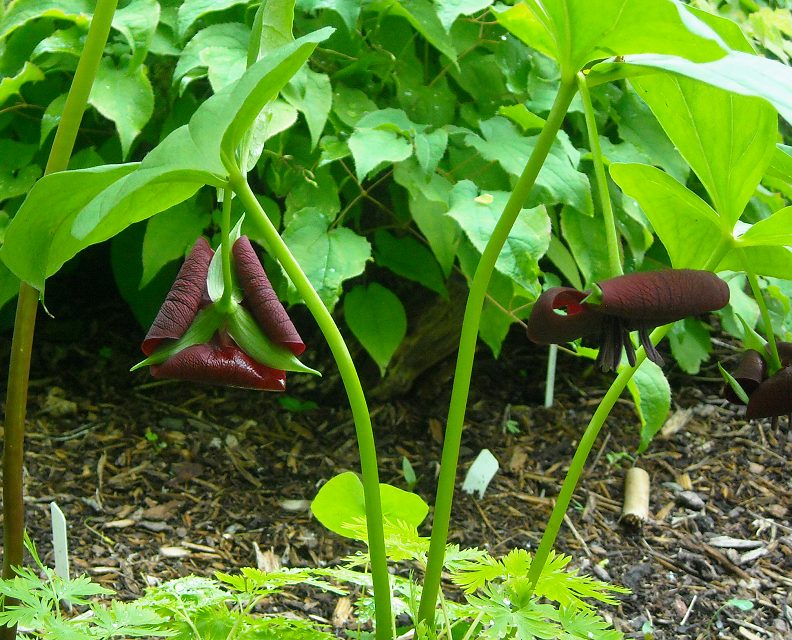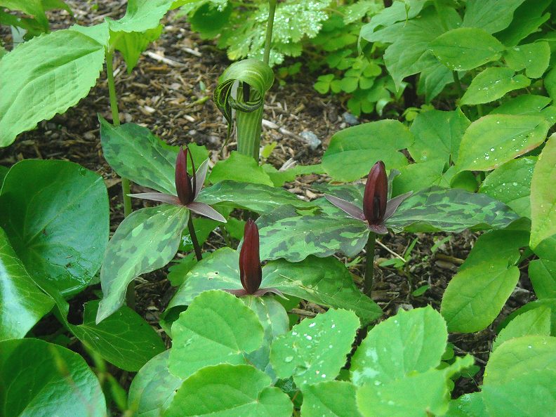 A small grouping of Trillium foetidissimum, with a form of Arisaema triphyllum beyond. The trillium blooms are indeed lightly foetid smelling, but only at very close hand with one's nose stuck into the flower... an attractive little Trillium only about 5-6" tall.