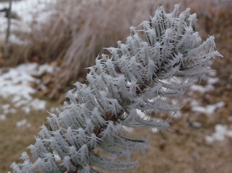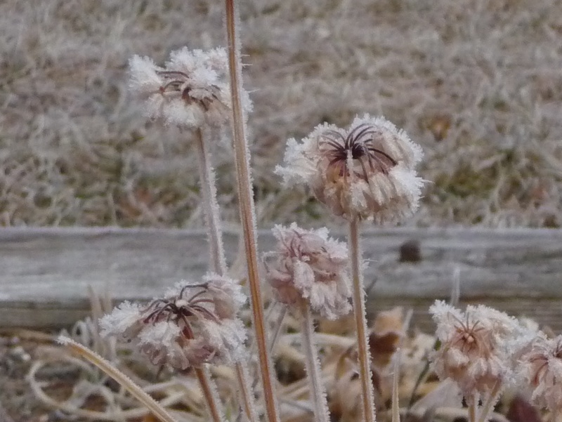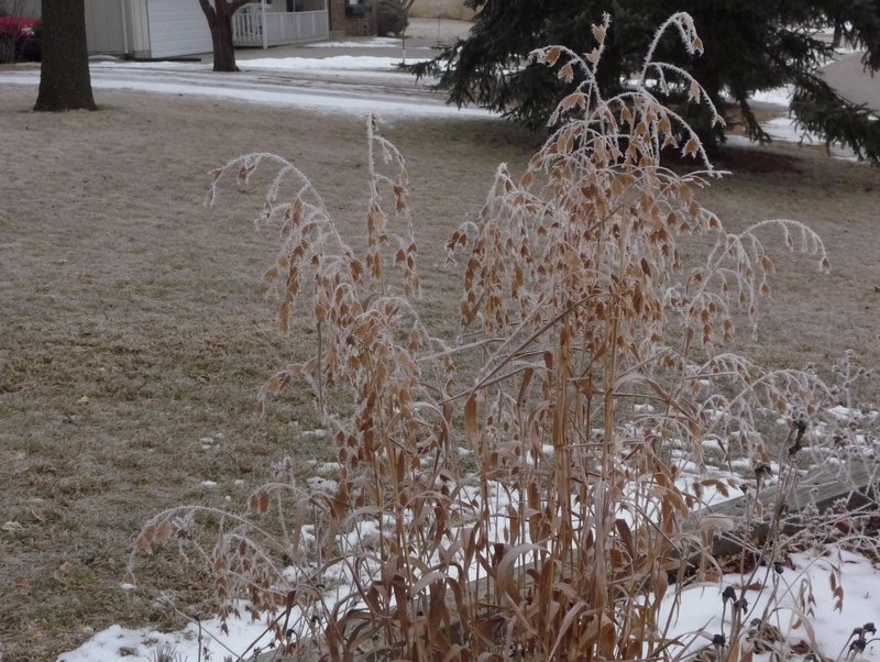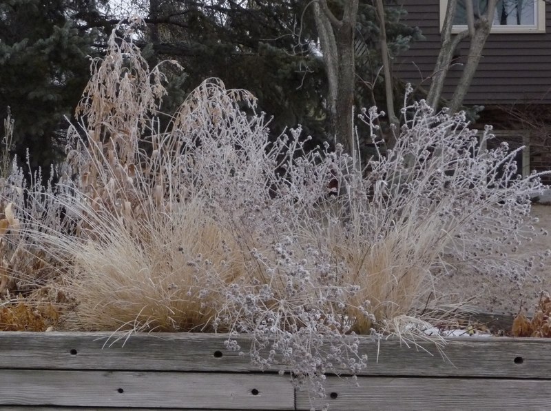 We've had a couple dreary winter foggy days in this snowless winter, and the frost is beginning to build.  Leaving some of the perennials intact through the winter has proven to a wise decision this year.