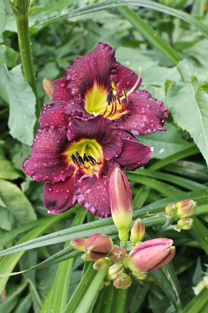 Hemerocallis 'Bela Lugosi' (with its usual "off" colour in my conditions - should be very deep purple) and 'Yellow Pinwheel'; strangely enough, many of the daylilies didn't even bloom last year but there is a more normal showing this year: