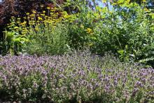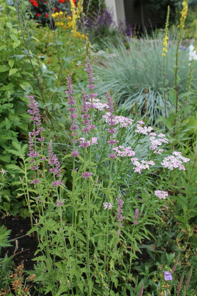Agastache pringlei, an alpine native to the mountain ranges of New Mexico and Mexico, starting to bloom - despite the usual zone 6 rating, it is much hardier - with Achillea sibirica in the background: