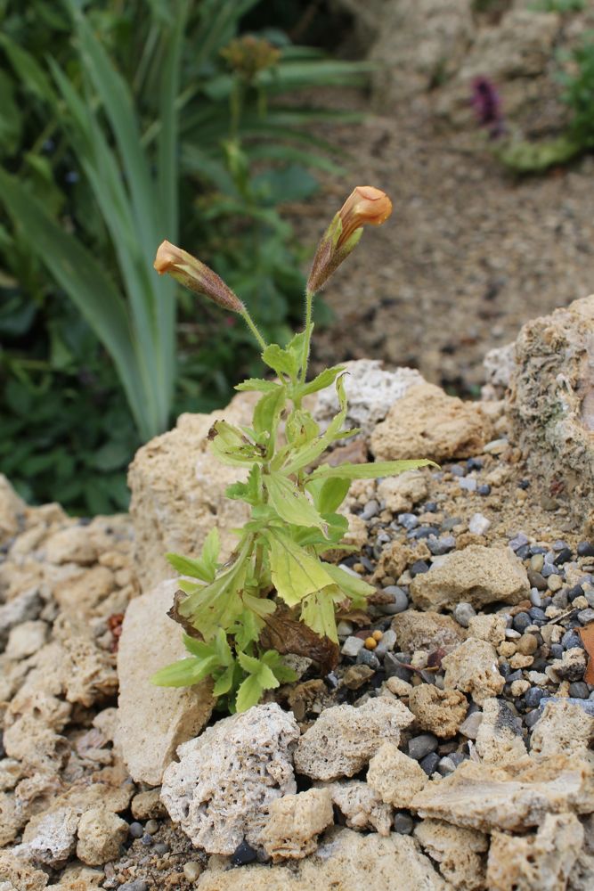This was supposed to be Erysimum humillinum but it's shaping up to be a orange-flowered Mimulus, from what I can tell so far.  I do reuse potting soil from year to year, so who knows where it came from?  Poor thing is rather pallid (I have given it fertilizer) though the flower will be quite vivid: