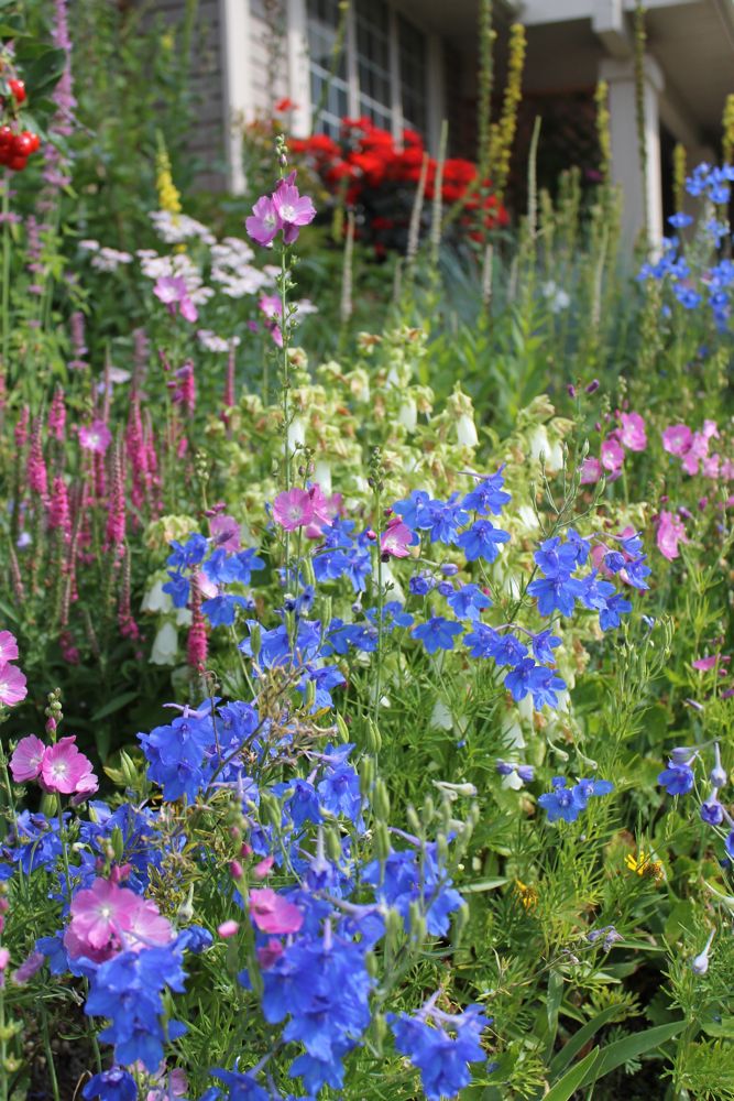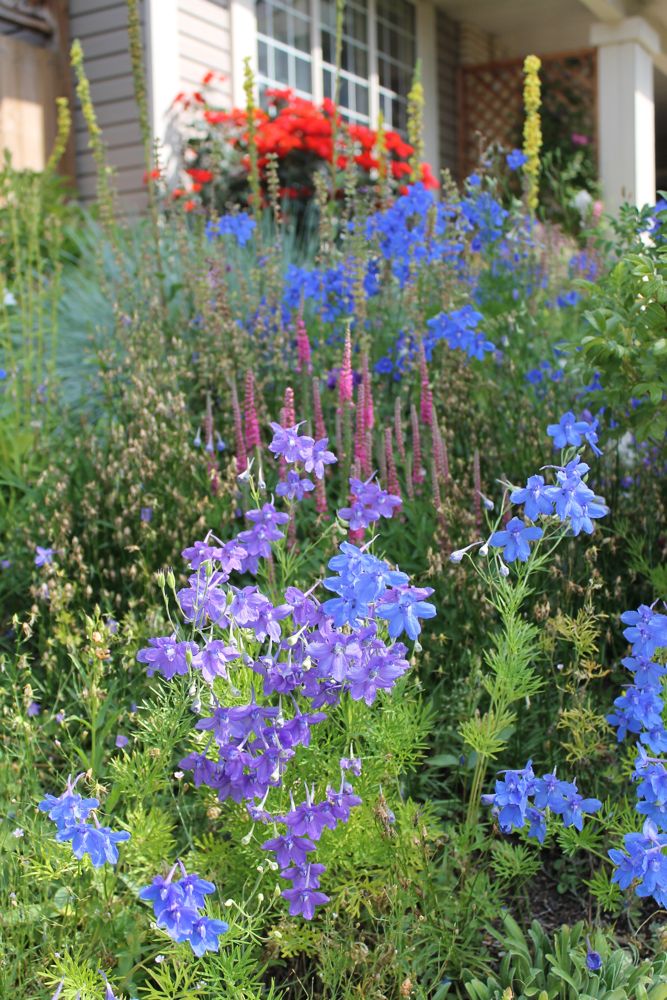 Lori, the light sky-blue Delphiniums are my favorite and to have them juxtaposed with a bright rose is wonderful! You go girl!