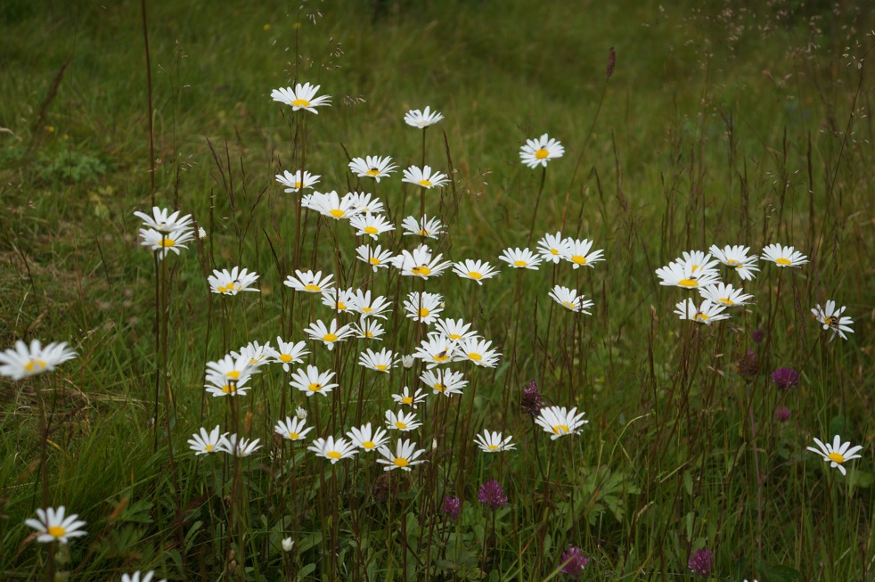 Arnica montana is endangered in Norway due to disappearing pastures. Leucanthemum vulgare is common but this montane form is more delicate than the lowland form. Rosa majalis grows in the low alpine zone some places.