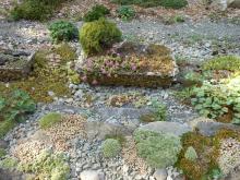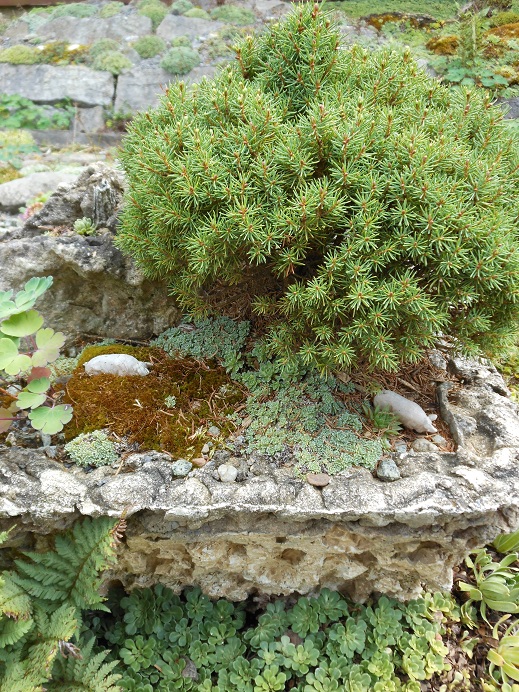 The south face of The Rock in high summer. The dark bun at upper left (north face) is a Daphne arbuscula much, much larger than a man's head. It may, indeed, qualify as gargantuan for the species! The white patches are lime dabbing. The second photo shows my most proud trough with Sedum pluricaule, a welcome August blooming alpine. I think that's a 'Jaqueline Verkade' spruce in there too, Selaginella densa covers the ground, a silver Saxifrage has seeded into the central chunk of Bighorn dolomite. It is a trough upon which all has been well for well over a decade.
