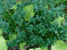Hosta nigrescens, Buxus sempervirens 'Vardar Valley' amongst Hosta 'Vanilla Cream' and Hosta clausa var. clausa flowers.  I need an "iredescence" button in my photo imaging program.  The color is actually flat compared to real life.