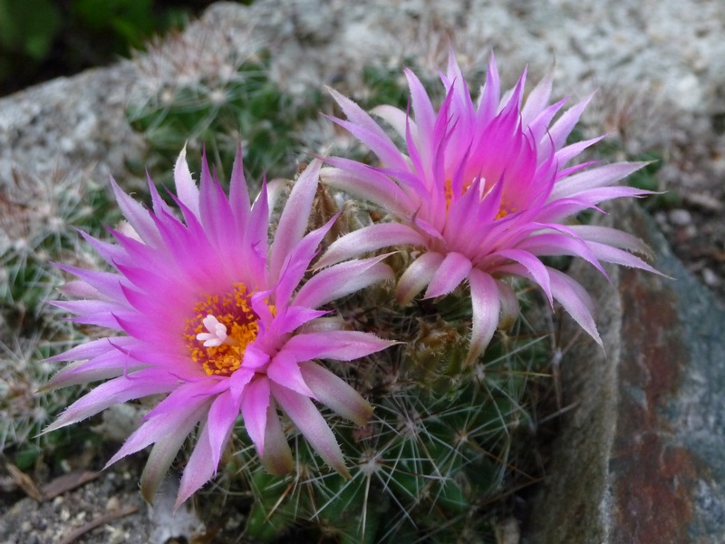 To the right of the rhubarb is a trough with Coryphantha (Escobaria) vivipara from the Rapid City area of South Dakota. It bloomed a few days ago.