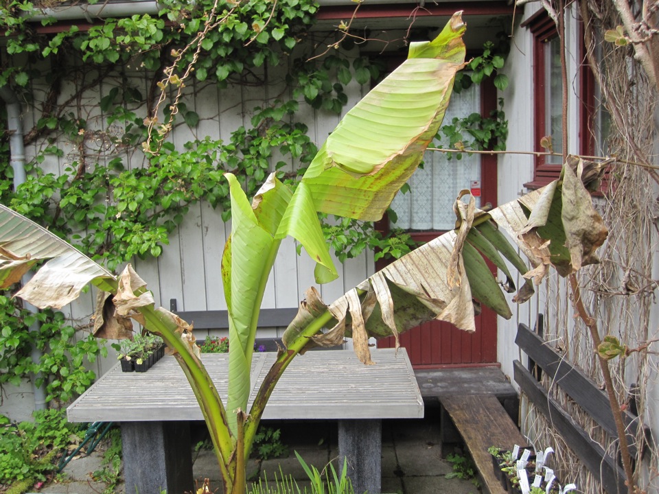 The first peony to flower is P. mairei. It is almost at schedule but all the rest of them are very late this season. Many rhododendrons have suffered in the strong winds and lost buds and flowers. Some are completely defoliated too from the hurricane last winter. However quite a few manage to flower still, here is Rh cinnabarinum Roylei. The banana plant does actually grow (in a pot) outside in the cold weather but the leaves are damaged although it sits in the most sheltered place I have!