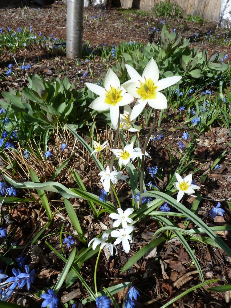 Tulipa turkestanica; Chionodoxa 'Pink Giant'; Corydalis nobilis (x2); Narcissus 'Jetfire':