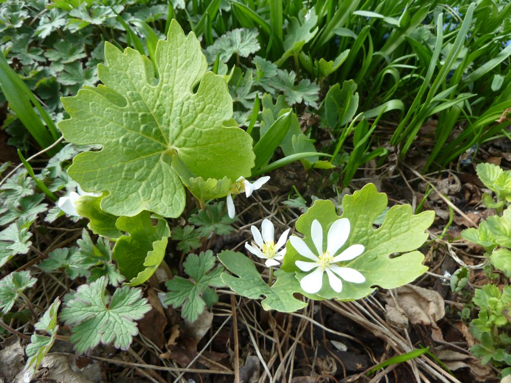 Syneilesis aconitifolia, and S.aconitifolia, Hosta nigrescens, Epimedium seedling, Podophyllum hexandrum, Iris cristata.